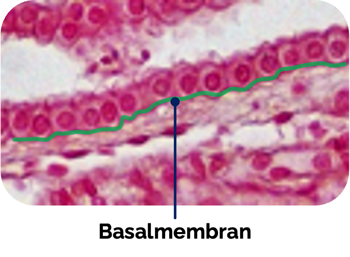 - Lichtmikroskopisch erkennbar als lineare Struktur unterhalb des Epithels, elektronenmikroskopisch lässt sich die Basalmembran in drei Schichten unterteilen