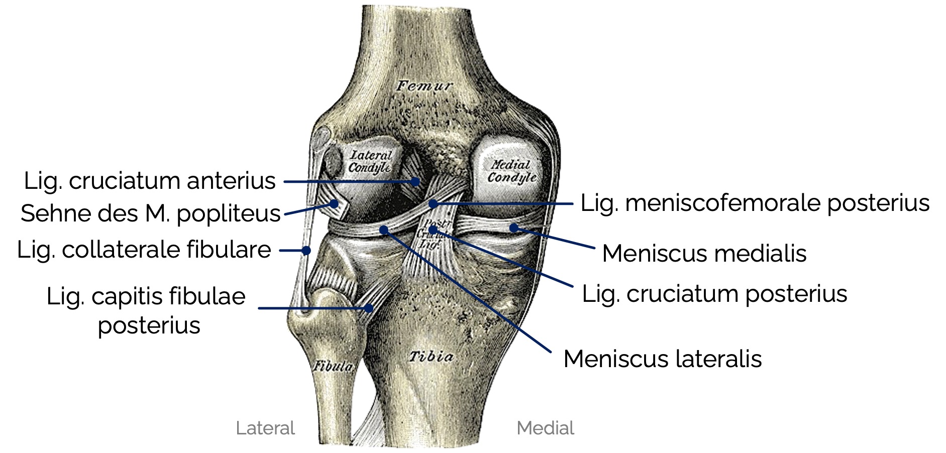 OpenStax AnatPhys fig.9.19 - Knee Joint - English labels " at AnatomyTOOL.org by OpenStax, license: Creative Commons Attribution. Source: book 'Anatomy and Physiology', https://openstax.org/details/books/anatomy-and-physiology. Diese Abbildung ist ein Derivat, der oben angegebenen Quelle. Es wurden die Markierungen und Beschriftungen ergänzt.