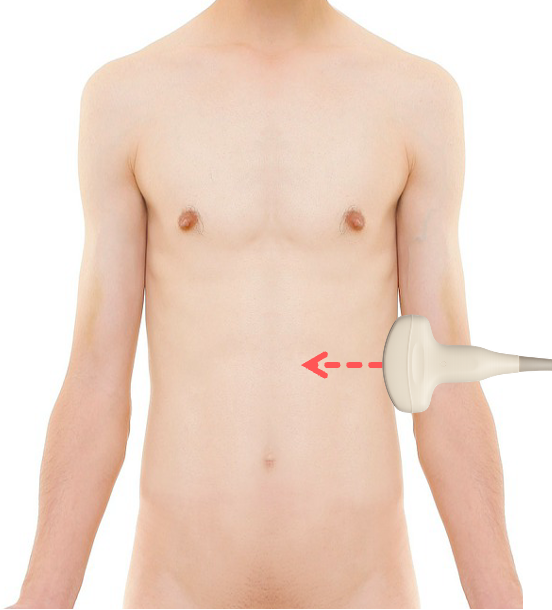 , Schall zwischen zwei Rippen hindurch ➜ Schallrichtung, sodass Milz und Niere im Bild sind - Ausrichtung: Marker zeigt nach kranial
