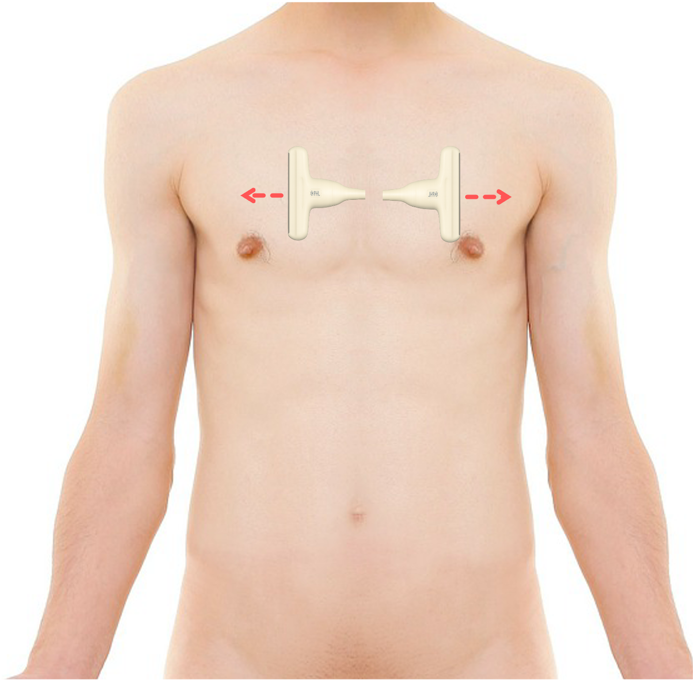 Figure 1 aus Ketelaars, R., Reijnders, G., van Geffen, GJ. et al. ABCDE of prehospital ultrasonography: a narrative review. Crit Ultrasound J 10, 17 (2018). https://doi.org/10.1186/s13089-018-0099-y. Teilausschnitt des Originalbilds. Es wurden teilweise die Markierungen und Beschriftungen ergänzt.