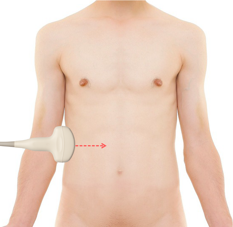 , Linksseitenlage - Position: Rechter Oberbauch, mittlere Axillarlinie, Höhe 10.–11. Rippe
