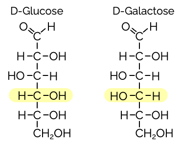 und D-Galactose sind Epimere, da sie sich an der Konfiguration des C4-Atoms unterscheiden. Glucose und Mannose sind Epimere, da sie sich am C2-Atom unterscheiden